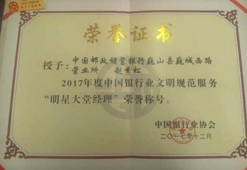 近日,在2017年中國(guó)銀行業(yè)“明星大堂經(jīng)理”評(píng)選活動(dòng)中,大理州巍山縣分公司趙秀松同志以出色的表現(xiàn)榮獲中國(guó)銀行業(yè)文明規(guī)范服務(wù)“明星大堂經(jīng)理”稱號(hào)。