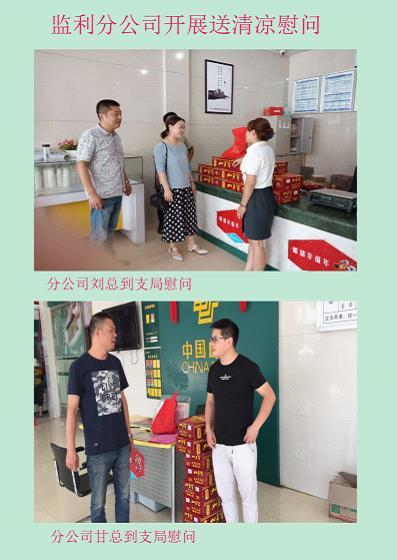 監(jiān)利縣分公司領(lǐng)導(dǎo)班子3人均是“80后”,年輕的領(lǐng)導(dǎo)班子始終堅持以人為本,心系一線職工。進(jìn)入三伏天后,天氣持續(xù)高溫,三位年輕的領(lǐng)導(dǎo)冒著酷暑分頭到各支局、投遞站、包裹快遞部、郵件處理班為生產(chǎn)一線的員工送去了暑藥和涼茶。總經(jīng)理楊欽華說“員工幸福我幸福,我為員工送清涼”。他要求支局經(jīng)理做好高溫天氣職工的防暑降溫工作,注意生產(chǎn)安全和人身安全,希望投遞員師傅早點出班,防止中暑。并鼓勵支局員工不畏高溫,搶抓當(dāng)前業(yè)務(wù)發(fā)展政策和保險產(chǎn)品,確保全年保險計劃的達(dá)成。(湖北省郵政工會)