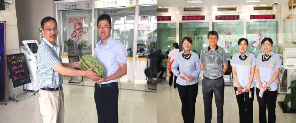 炎炎夏日送清涼,黃山市分行為全行員工統(tǒng)一配發(fā)了綠豆、冰糖、藿香正氣丸、風油精、驅(qū)蚊花露水和其他日化等防暑降溫用品,各區(qū)縣支行也分別開展“夏送清涼”慰問活動。近日上午,市分行行長劉宏平和副行長葉文虎分別攜帶西瓜和防曬傘前往所屬支行開展“送清涼”慰問。每到一處,劉宏平行長和葉文虎副行長把大西瓜送到支行辦公室,將防曬傘一一發(fā)給客戶經(jīng)理,并詢問大家工作和身體情況,叮囑大家要注意勞逸結(jié)合,提醒客戶經(jīng)理外出走訪要做好防暑和人身安全防護工作,保持手機聯(lián)系暢通。同時,要求支行加強消防設施的日常檢查和維護工作,既要確保安全度過高溫季節(jié),又要確保經(jīng)營服務工作不滑坡,為完成全年工作目標打下良好基礎。