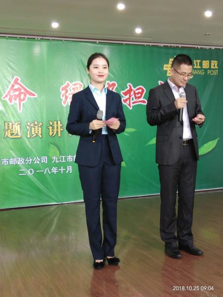 10月25日下午,為充分展示企業(yè)良好形象和企業(yè)員工愛崗敬業(yè)、奮發(fā)有為的精神風(fēng)貌,由九江市分公司和市郵政工會(huì)聯(lián)合舉辦了“初心使命 綠郵擔(dān)當(dāng)”主題演講比賽決賽。