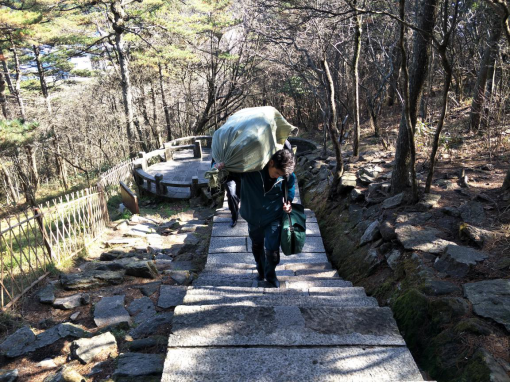 光明頂是黃山風(fēng)景區(qū)第二大高峰,海拔1860米,黃山701臺(tái)、黃山氣象站就坐落在這里。從北海到光明頂?shù)穆烦逃?000多米,全是上行臺(tái)階,游步道上的游客到了光明頂都會(huì)越走越慢,氣喘吁吁,特別是冬季,臺(tái)階上結(jié)了薄冰,行走更加困難,不小心極易摔倒,謝菲俊每天都要負(fù)重近50公斤爬上去,把郵件安全送到用戶手中,三年來,他已磨壞了8雙運(yùn)動(dòng)鞋,個(gè)中艱辛可想而知。