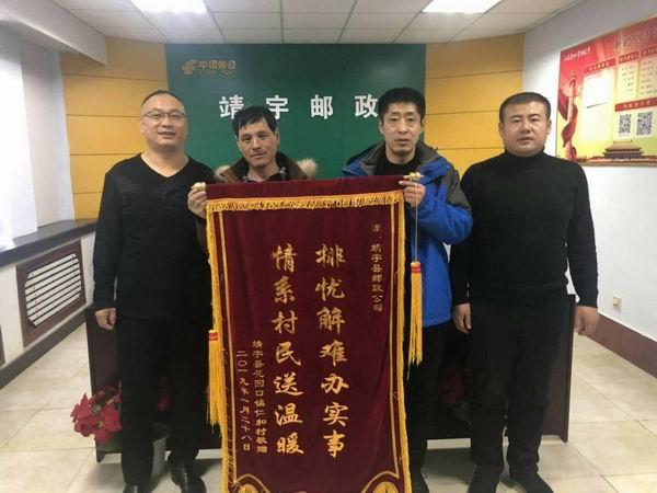 1月31日下午,靖宇縣花園口鎮(zhèn)仁和村村書記陳安高來到靖宇縣郵政分公司,將一面寫著"排憂解難辦實(shí)事、情系村民送溫暖"字樣的錦旗送到縣公司領(lǐng)導(dǎo)班子手中,鮮艷的錦旗代表著村民對靖宇郵政一直以來對仁和村脫貧工作的肯定和為村民解難事、辦實(shí)事由衷的謝意。