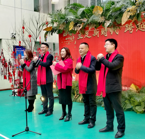 6樓的羽毛球場,經(jīng)過兩天的精心布置,在主題“立足新時代、跨越新目標(biāo)”致敬改革開放40周年的巨幅宣傳板周圍,裝點(diǎn)著鮮花和綠葉,象征著春天即將到來所迸發(fā)出的勃勃生機(jī),四周掛上了中國傳統(tǒng)文化的年畫和燈籠,兩行長桌上放上了精美的糕點(diǎn)和水果,空氣中彌漫著新春的氣息和喜悅。