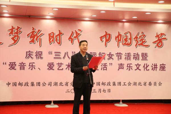荊楚三月,春光明媚。3月7日下午,湖北省分公司舉行慶?!叭恕眹H婦女節(jié)活動暨“愛音樂 愛藝術(shù) 愛生活”聲樂文化講座,表彰2018年度全省郵政企業(yè)女職工先進集體和優(yōu)秀女職工,發(fā)起“讓閱讀成為一種生活方式”倡議,希望全省郵政女職工爭做知性修身的踐行者、企業(yè)發(fā)展的推動者和中華美德的傳承者。