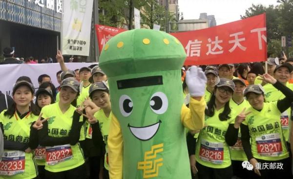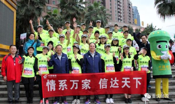配合《馬拉松》特種郵票首發(fā),中國(guó)郵政集團(tuán)公司重慶市分公司專(zhuān)程組織了“跑團(tuán)方陣”參與“重馬”。來(lái)自部分市級(jí)部門(mén)(單位)、區(qū)縣分公司及市寄遞事業(yè)部的30名“跑馬”選手身著印有中國(guó)郵政LOGO的參賽制服,拉起“情系萬(wàn)家、信達(dá)天下”的宣傳橫幅,帶上一只“郵筒”,成為賽場(chǎng)上一道亮麗的“綠色風(fēng)景”。 早上7點(diǎn),張榮林特意趕在比賽前慰問(wèn)了重慶郵政參賽選手。當(dāng)?shù)弥蠹襾?lái)自不同崗位,且大多數(shù)是優(yōu)秀共產(chǎn)黨員、先進(jìn)生產(chǎn)者、服務(wù)明星、“6+2”業(yè)務(wù)發(fā)展能手等時(shí),張榮林豎起大拇指為他們點(diǎn)贊。