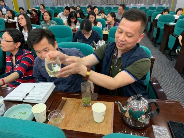 當天上午,首期培訓的主要內(nèi)容是中國茶文化脈絡、飲茶與健康、中國茶葉分類、綠茶加工工藝、綠茶沖泡方法與實操、綠茶功效與儲存。熊老師一邊示范一邊熱情地為大家講解茶學知識,從“識茶、品茶、茶禮儀、茶與健康、茶與修養(yǎng)等有關茶文化知識進行了細致的講解和示范,及沖泡技術。