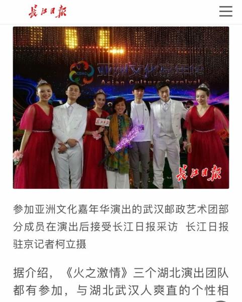 郵政藝術(shù)團(tuán)的優(yōu)秀表現(xiàn)受到了省內(nèi)各大媒體的關(guān)注和爭相報(bào)道。團(tuán)長龔焰在接受《長江日報(bào)》記者采訪時說:“《火之激情》節(jié)目因需要與外國藝術(shù)家同臺,音樂合成難度很大。有些國外藝術(shù)團(tuán)隊(duì)前期排練的音樂與嘉年華演出的音樂有差別,必須重新錄音合成,這個節(jié)目與多個外國演出團(tuán)隊(duì)合作,每來一個國家我們都要重新合成一次音樂,工作量是加倍的,對演員來說很具有挑戰(zhàn)性。”