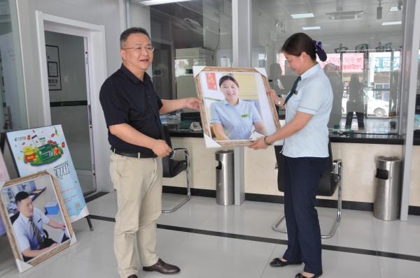 “真的很開心,平時都忙著上班,很少有機會看到自己工作時的樣子,感謝領(lǐng)導的關(guān)注,這張照片我要好好珍藏?!苯衲?4歲的夏嫻,2006年進入郵政,現(xiàn)在是瓦坊支局的一名儲蓄柜員。7月8號,對夏嫻來說,是一個特別的日子,這天下午,她從市分公司副總經(jīng)理、工會主席郭大江手中接過一張自己的照片。照片中,她手拿宣傳單頁,正準備出去走訪,笑容親切,充滿感染力。