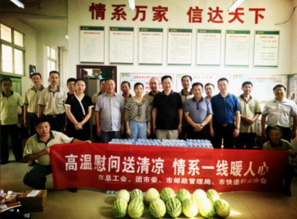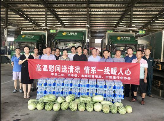 8月2日上午,咸寧市總工會張恩和副主席、團(tuán)市委李雪梅副書記、市郵政管理局楊正合局長、市快遞行業(yè)協(xié)會等領(lǐng)導(dǎo)一行,在市分公司辛紅輝副總經(jīng)理、工會負(fù)責(zé)人的陪同下,深入岔路口投遞站、網(wǎng)路運(yùn)行中心開展“關(guān)愛快遞小哥 夏日送清涼”慰問活動,為戰(zhàn)斗在高溫一線的投遞員、駕押員、分揀員送上礦泉水、西瓜。