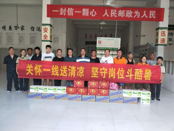 入伏以來(lái),黃岡持續(xù)出現(xiàn)高溫天氣,氣象臺(tái)多次發(fā)布高溫預(yù)警,給郵政生產(chǎn)經(jīng)營(yíng)特別是外勤作業(yè)帶來(lái)考驗(yàn)。7月30-8月6日,市分公司組織開(kāi)展了“夏送清涼”關(guān)愛(ài)員工活動(dòng),市分公司領(lǐng)導(dǎo)胡智宏、易禮軍、李列,帶上防暑降溫慰問(wèn)品走進(jìn)基層,看望慰問(wèn)高溫下奮戰(zhàn)在一線的員工,要求各單位切實(shí)做好防暑降溫和后勤保障工作,將關(guān)心關(guān)愛(ài)送到員工的心坎上。