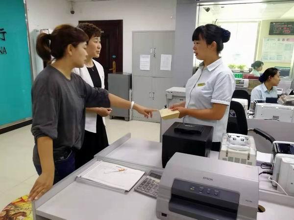 圖為輝南縣分公司工會主席將愛心捐款送到張雪手中