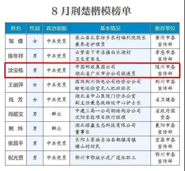 8月24日,“荊楚楷?!?/font>8月上榜人物名單揭曉,中國郵政集團(tuán)公司湖北省廣水市分公司投遞員沈?qū)殫澃裆嫌忻?/font>