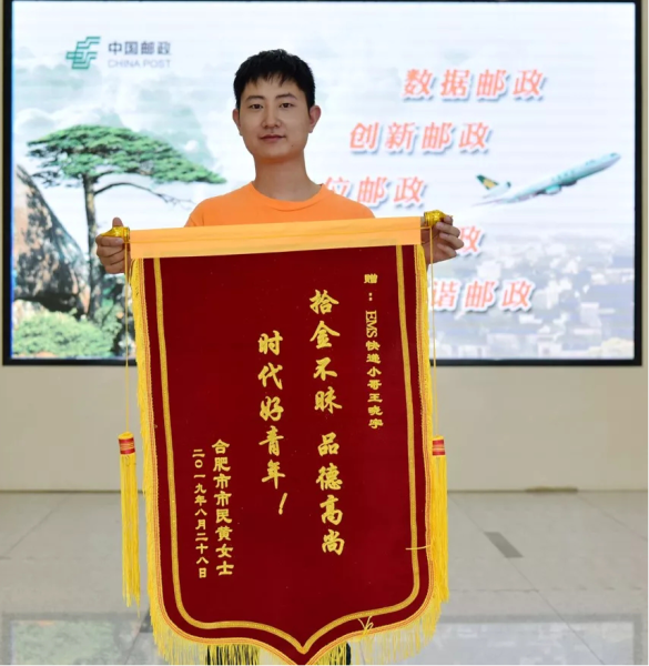 8月29日上午,合肥市民黃女士來到合肥市郵政分公司,向寄遞部員工王曉宇同志贈送錦旗,稱贊其為“時代好青年”。