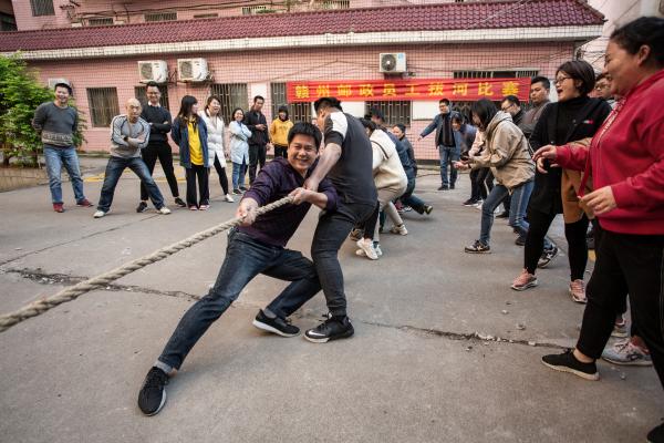 比賽現(xiàn)場,參賽隊員們緊握繩索,身子稍往后傾,拉開“弓字步”,凝神聚氣,一觸即發(fā)。只聽裁判一聲哨響,比賽雙方的隊員們立刻卯足勁兒往后拔,大家漲紅著臉,咬緊牙關(guān),使出了全身的力氣往后來拽繩子?!耙欢佑停∫欢佑?!……”啦啦隊吶喊著,為場上隊員們加油鼓勁,氣勢絲毫不遜于參賽隊員?,F(xiàn)場吶喊聲、加油聲、歡笑聲此起彼伏,像是在奏響一支氣勢磅礴的交響曲,激勵著每一位拔河隊員迸發(fā)出“怒放的生命”激情。經(jīng)過激烈的角逐,最終章貢區(qū)分公司隊以全勝戰(zhàn)績成功衛(wèi)冕了冠軍。