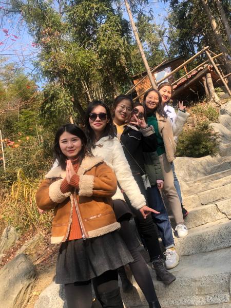 當天上午一路上,大家迎接著車窗透進來的絲絲陽光,歡聲笑語不絕于耳。大約1個小時左右的車程,到達了梅嶺太陽谷風景區(qū)。景區(qū)的小溪邊、山坡上,成片的松樹林、梅樹林,在漫山遍野的毛竹林的映襯下,營造著天然氧吧的清新空氣。隨著山勢與樹林的變換,散落著幾處具有江南風格的亭臺和小橋。大家頻頻取景拍照,留下美景的瞬間,享受著這份工作之余的休閑時光。