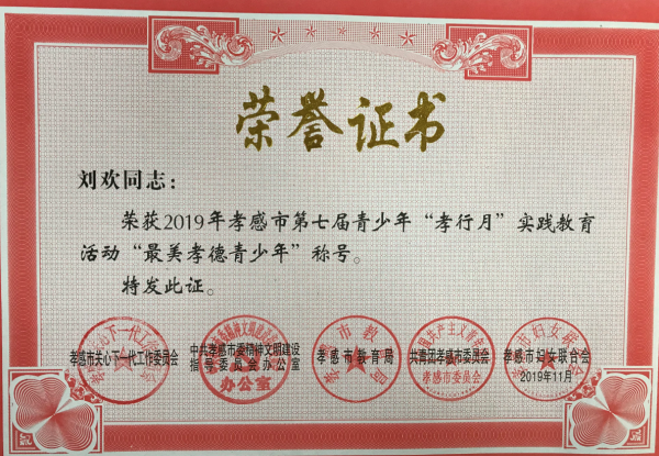近日,孝感市直第七屆“孝行月”實踐教育活動總結(jié)表彰大會在云夢縣舉行,會議表彰了在第七屆“孝行月”活動中涌現(xiàn)出來的美美孝德青年少、最佳家長、最佳五老志愿者、最優(yōu)班主任,并為他們頒發(fā)了榮譽證書和紀念品。孝感郵政2名職工受到了表彰,其中劉歡榮獲“最美孝德青少年”稱號,郭元發(fā)榮獲“最佳五老志愿者”稱號。