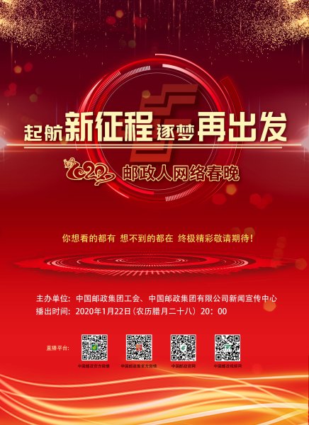 為深入學(xué)習(xí)貫徹黨的十九大精神,落實(shí)習(xí)近平總書記關(guān)于“凝心聚力、成風(fēng)化人”的宣傳指導(dǎo)思想,以及集團(tuán)公司黨組提出的宣揚(yáng)郵政勞模精神、展示中國郵政發(fā)生的翻天覆地的變化和快速發(fā)展壯大的碩果,同時(shí)讓廣大郵政職工在繁忙的工作之余過個(gè)喜樂年、幸福年,共享郵政改革發(fā)展成果,值此2020年春節(jié)來臨之際,中國郵政集團(tuán)工會(huì)、集團(tuán)公司新聞宣傳中心聯(lián)合舉辦2020郵政人網(wǎng)絡(luò)春晚。經(jīng)過緊張籌備,晚會(huì)直播進(jìn)入倒計(jì)時(shí),將于2020年1月22日(農(nóng)歷臘月二十八)晚上8點(diǎn)(20:00)現(xiàn)場直播。