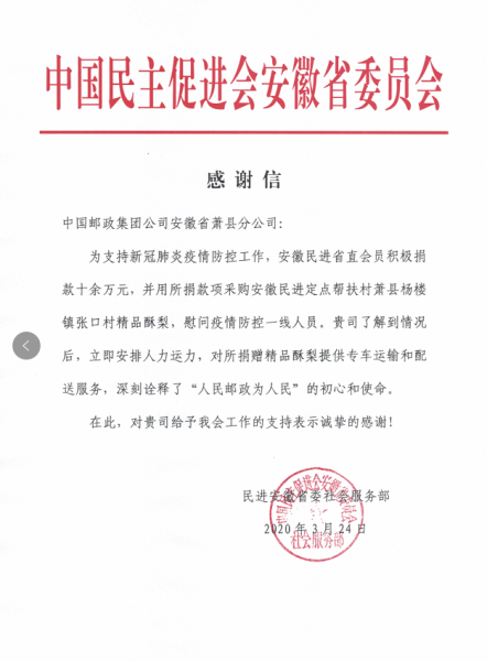3月24日,中國民主促進會安徽省委員會給蕭縣分公司發(fā)來一封感謝信,感謝郵政對所捐贈精品酥梨提供專車運輸和配送服務(wù)。
