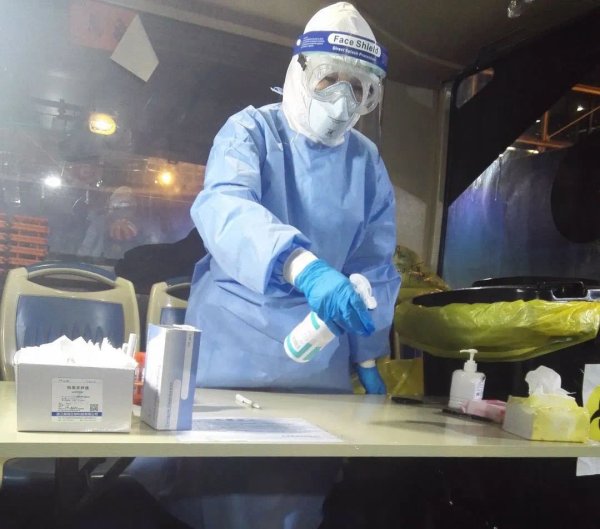 到達(dá)浦東機場后,她們的主要任務(wù)是采集咽拭子做核酸檢測,姑娘們第一時間進(jìn)入工作區(qū)域,經(jīng)過前輪隊員傳遞崗位信息、傳授實戰(zhàn)經(jīng)驗,大家快速熟悉工作環(huán)境和流程,力爭把控操作和采樣流程的每個環(huán)節(jié)都熟記于心,開始了“24小時待命”。上崗第一天就有臨時通宵航班任務(wù),姑娘們主動請纓工作通宵,這對剛剛適應(yīng)穿著防護(hù)服、戴著N95口罩防護(hù)眼鏡工作的人是極大的體力和意志的考驗,但是她們沒有一句怨言,堅決服從安排,互相打氣,誓要以最高質(zhì)量完成支援任務(wù)。同時防護(hù)服和防護(hù)用具的穿脫是工作中最重要的環(huán)節(jié),大家在穿戴后互相幫忙,互相檢查,互相指導(dǎo),不容許絲毫馬虎和疏漏,堅決做到一旦進(jìn)采樣點就要保證規(guī)范、避免交叉感染,百分之百確保防護(hù)安全。