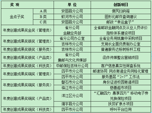 一年來(lái),全省各級(jí)郵政企業(yè)緊緊圍繞企業(yè)創(chuàng)新發(fā)展,以“三個(gè)視角”找差距,以“三大規(guī)律”促改革,通過(guò)全業(yè)務(wù)、全流程、端到端、各環(huán)節(jié)、全要素對(duì)標(biāo),找短板、補(bǔ)弱項(xiàng)、強(qiáng)能力,確定創(chuàng)新改進(jìn)的“靶點(diǎn)”,重點(diǎn)鼓勵(lì)體驗(yàn)改善、成本節(jié)約、效率提升、流程優(yōu)化等方面的小革新小創(chuàng)造。建立全員創(chuàng)新思維,探索適于本地區(qū)發(fā)展的創(chuàng)新工作模式,深挖基層創(chuàng)新創(chuàng)意源頭活水,采取有力措施推進(jìn)創(chuàng)新工作全員化、常態(tài)化、制度化。日前,經(jīng)吉林郵政創(chuàng)新大賽評(píng)委會(huì)認(rèn)真評(píng)選,最終確定金點(diǎn)子獎(jiǎng)、年度創(chuàng)意成果獎(jiǎng)若干名,并給予相關(guān)獎(jiǎng)勵(lì)。