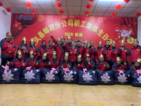 在來鳳公司食堂中央布置著“來鳳縣分公司郵政職工集體生日活動”巨大噴繪,大廳內大紅燈籠懸掛、氣球飄舞、桌上擺滿了各類水果、糖果及精美禮品等、餐桌中擺滿了豐盛的晚餐,穿梭于此的41名職工是今天晚會的主角,哪怕窗外大雨磅礴、寒風凜冽,但被室內熱烈的吆喝聲、問候聲和祝福聲所掩蓋,這里,完全沉浸在一片溫馨祥和幸福的海洋之中……
