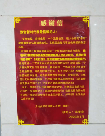 原來,2018年的一天黃昏,一位保定的客戶來到解放中路營業(yè)所,想辦理轉(zhuǎn)帳業(yè)務(wù)。但因?yàn)橐呀?jīng)下班,柜臺無法再為客戶辦理業(yè)務(wù)。理財(cái)經(jīng)理就帶著客戶到廳外的自助柜員機(jī)上辦理。等客戶走后,理財(cái)經(jīng)理想去自動柜員機(jī)防護(hù)倉里打掃衛(wèi)生,恰巧看到機(jī)器臺面上放著200元鈔票,理財(cái)經(jīng)理馬上意識到這一定是剛才轉(zhuǎn)帳的客戶落下的,于是馬上去追,但人已經(jīng)找不到了。隨后,營業(yè)所工作人員通過賬戶信息,費(fèi)了一番周折后,才聯(lián)系到了客戶并將錢轉(zhuǎn)給了客戶。近日,這位客戶因到滄州處理業(yè)務(wù),專程來到了解放中路營業(yè)所,送給了營業(yè)員一張?zhí)貏e制作的大幅感謝信,并專門為此事制作了一個(gè)小視頻為營業(yè)員們播放,以表達(dá)自己心中的感激之情。