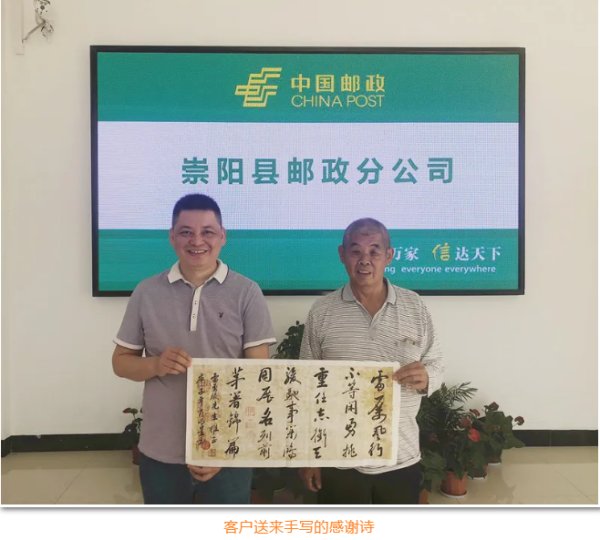 因工作變動,原白霓支局經(jīng)理雷勇駿調(diào)到崇陽分公司運(yùn)營監(jiān)控部工作,客戶肖明星到白霓支局辦理業(yè)務(wù)發(fā)現(xiàn)雷勇駿已不在支局,向支局工作人員詢問清楚后,連夜親筆寫了一副字畫和兩首詩,帶上自己種植的枇杷,非要親自送到雷勇駿的手里。