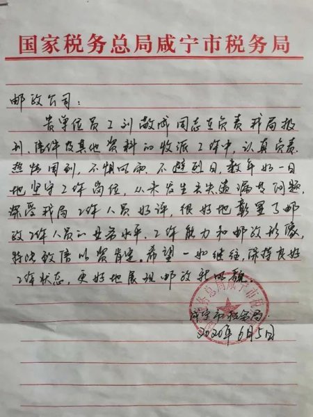 “劉敬成同志認真負責、熱情周到、不懼風雨、不避烈日,數(shù)年如一日地堅守工作崗位,從未發(fā)生丟失、遺漏等問題,深受我局工作人員好評……”近日,咸寧市郵政分公司收到一封來自咸寧市稅務局手寫的表揚信,信中高度贊揚該分公司溫泉城區(qū)投遞站投遞員劉敬成在日常工作中認真熱情,無丟失、無遺漏,默默堅守崗位的精神風貌。劉敬成究竟做了什么,能得到客戶如此肯定?