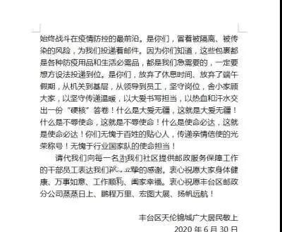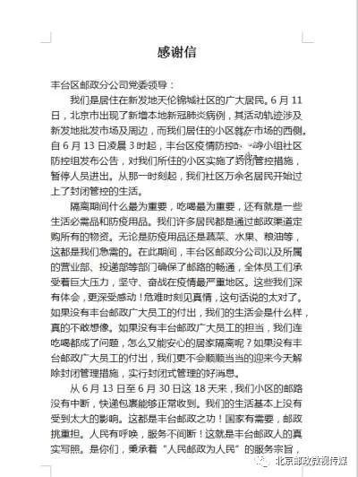 豐臺(tái)區(qū)分公司收到天倫錦城社區(qū)居民寫的一封感謝信,信中寫道:“從6月13日至6月30日,18天來(lái),我們小區(qū)的郵路沒(méi)有中斷,快遞包裹能夠正常收到。我們的生活基本上沒(méi)有受到太大的影響。這都是豐臺(tái)郵政之功!國(guó)家有需要,郵政挑重?fù)?dān)。人民有呼喚,服務(wù)不間斷!這就是豐臺(tái)郵政人的真實(shí)寫照?!笔裁词谴髳?ài)無(wú)疆,這就是大愛(ài)無(wú)疆! 什么是不辱使命, 這就是不辱使命!什么是使命必達(dá),這就是使命必達(dá)!”……一句句溢美之詞表達(dá)了社區(qū)居民對(duì)郵政人由衷的感謝,這是對(duì)郵政人辛苦付出的最好回饋?。ū本┼]政工會(huì))