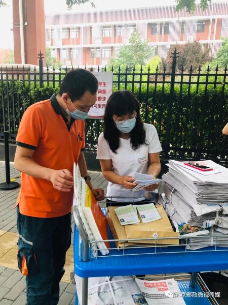 恰逢高考,不能進(jìn)入校園。老師和投遞員在學(xué)校門(mén)口進(jìn)行了仔細(xì)的清點(diǎn)交接。