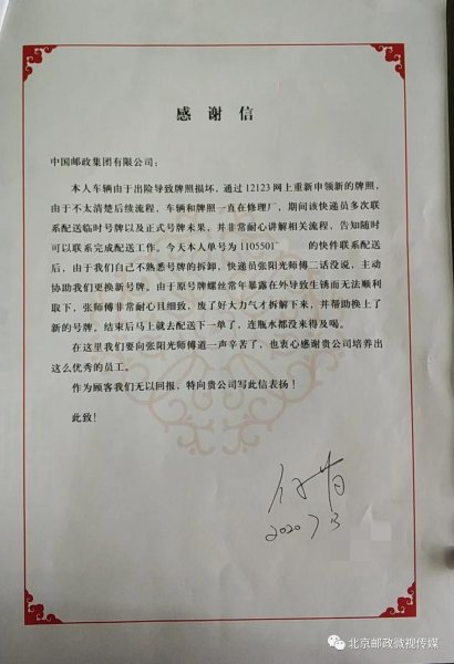 近日,市公司收到了一封感謝信。寫信人白先生細致的講述了通過12123網(wǎng)上重新申領新牌照及更換新牌照過程中,同城業(yè)務分公司員工張陽光對他的幫助。信中,他對耐心細致的投遞員張陽光表示感謝,并衷心感謝公司培養(yǎng)出這么優(yōu)秀的員工。