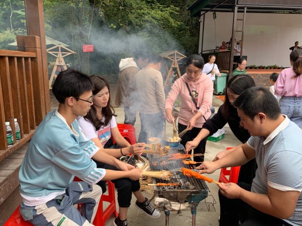 徒步活動結束后已到中午時分,燒烤活動開始了。大家分工合作、相互配合,各自拿出“十八班武藝”投入到燒烤活動中,體驗“自己動手豐衣足食”的樂趣。烤爐上放上肉串,刷上油,涂上醬,滋滋的烤肉聲,好不愜意!面對豐富的食物,大家烤得熱火朝天,吃著自己親手烤出的各種食品,聊著工作和生活中遇到的各種趣事,歡聲笑語連成一片,其樂融融。談笑間,忘卻了煩惱,緩解了疲勞,充分體驗了野外集體生活的樂趣。