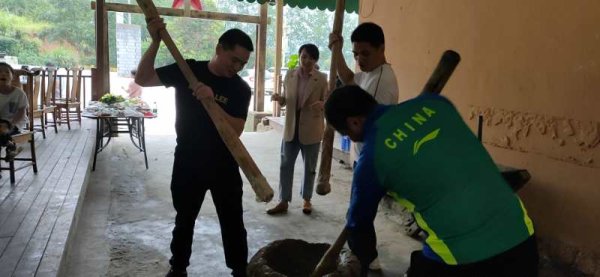 根據行程安排,下午2點半,大家開始了傳統(tǒng)民俗文化活動——打糍粑。會做的小伙伴們,齊心協(xié)力打糍粑、烙糍粑,現場其樂融融,笑聲不斷。