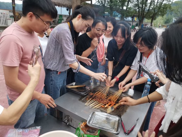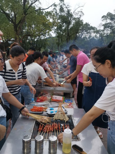 在鳳凰灣森林樂園,大家被美景吸引,三倆成群,四處游玩,放松心情,靜待一場愉快的燒烤活動。不一會兒,活動現(xiàn)場香味彌漫,烤肉讓人垂涎欲滴。各種串串一旦烤熟,馬上就被圍在烤攤邊上的員工一搶而空。為了趕上大家吃的速度,“燒烤大師們”一個個都卯足了勁。