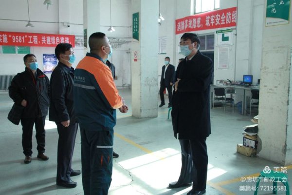 廉主席一行先后來(lái)到北旺投遞站、和平路營(yíng)業(yè)支局、市分公司職工之家、崔壯投遞班、大廠祁各莊營(yíng)業(yè)支局和大廠縣分公司職工之家進(jìn)行現(xiàn)場(chǎng)調(diào)研。廉福臣副主席在投遞之家詳細(xì)詢問(wèn)了投遞員工資待遇情況、攬收情況、備戰(zhàn)雙11的物料是否準(zhǔn)備充足等情況;在金融網(wǎng)點(diǎn)職工之家詳細(xì)了解了網(wǎng)點(diǎn)員工的生產(chǎn)生活狀況和金融跨賽開(kāi)展情況。在與市分公司領(lǐng)導(dǎo)班子及相關(guān)人員座談時(shí),聽(tīng)取了廊坊市分公司對(duì)工會(huì)重點(diǎn)工作推進(jìn)情況的匯報(bào)。