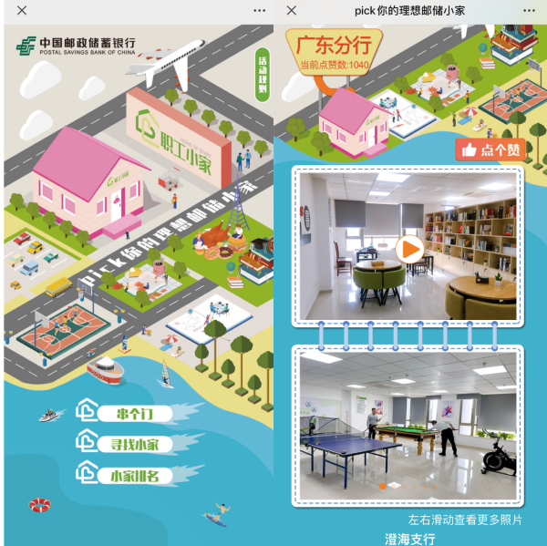 本次“職工小家”示范點線上展示評比活動在“郵儲銀行微工會”公眾號平臺上進行,利用H5技術(shù)通過視頻、照片等方式全方位展示全行不同地域職工小家示范點的精神風(fēng)貌和文化特色,使職工線上感受我行各具特色的“職工小家”家文化,票選職工心中理想郵儲職工小家。