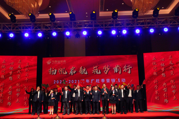 表彰晚會(huì)在市分公司工會(huì)編排的《戰(zhàn)鼓》中拉開(kāi)本次大會(huì)的序幕,鼓樂(lè)聲聲響徹全場(chǎng);和縣分會(huì)歌伴舞《超越夢(mèng)想 郵政遠(yuǎn)航》詮釋了廣大員工跨賽以來(lái)所做出的不凡業(yè)績(jī);機(jī)關(guān)工會(huì)配樂(lè)詩(shī)朗誦《致敬,我們心中的最美》從不同角度謳歌馬鞍山郵政人敢與拼搏的企業(yè)精神。之后萬(wàn)頃總經(jīng)理首先從“不經(jīng)冬寒不知春暖”肯定了2020-2021旺季金融營(yíng)銷活動(dòng)取得的來(lái)之不易的成果,奮斗汗水澆灌夢(mèng)想之花;然后萬(wàn)總從市場(chǎng)占有率、旺季點(diǎn)均余額及資產(chǎn)分析我們與同業(yè)機(jī)構(gòu)、與先進(jìn)單位之間的差距,指出馬鞍山郵政金融未來(lái)可期;提出征途漫漫,唯有不懈奮斗,始終以“干在實(shí)處 走在前列 科學(xué)發(fā)展”為工作指引,為早日實(shí)現(xiàn)馬鞍山市分公司余額規(guī)模200億目標(biāo),全體馬鞍山郵政人應(yīng)保持夢(mèng)想在心,更須”快馬“加鞭!
