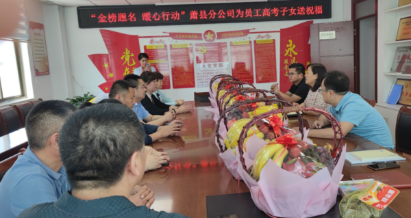 糕點粽子—高考得中,橙子—稱心如意,提子—金榜題名,火龍果—紅紅火火,蜜瓜—筆下生花,蘋果一馬平川,荔枝—勵志。在代表“高中”寓意的果籃前,在領導的聲聲祝福下,6月4日上午,蕭縣分公司開展“金榜題名· 暖心行動”員工高考子女送祝?;顒?,給家中有高考子女的員工打了一劑“強心針”。