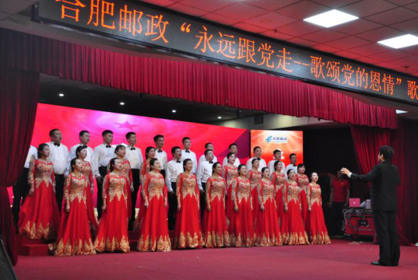 市分公司黨委班子全體成員、15支參賽隊(duì)伍,近400名職工參賽,用歌聲抒發(fā)對(duì)黨和國(guó)家的熱愛之情,堅(jiān)定永遠(yuǎn)跟黨走的決心,共同慶祝中國(guó)共產(chǎn)黨百年華誕。 比賽中,整齊統(tǒng)一的特色著裝、豐富多樣的藝術(shù)形式、昂揚(yáng)向上的精神風(fēng)貌,各代表隊(duì)在舞臺(tái)上顯身手、展風(fēng)采,激情澎湃、豪情滿懷地唱響《不忘初心》《相遇百年》《在燦爛陽光下》《我和我的祖國(guó)》《沒有共產(chǎn)黨就沒有新中國(guó)》《保衛(wèi)黃河》《歌唱祖國(guó)》等一曲曲經(jīng)典紅歌,用歌聲回顧黨的百年偉業(yè),用真情歌頌黨的光輝歷程,用真摯的情感唱出對(duì)黨和祖國(guó)的熱愛與崇敬。 一首首膾炙人口的紅歌唱響了時(shí)代主旋律,一聲聲情真意切的祝福唱出了合肥郵政人紅心向黨、胸懷祖國(guó)的質(zhì)樸情感。經(jīng)過比拼,城區(qū)寄遞快包部聯(lián)合代表隊(duì)獲得一等獎(jiǎng);機(jī)關(guān)聯(lián)合代表隊(duì)和肥西縣分公司代表隊(duì)分獲二等獎(jiǎng);巢湖市分公司代表隊(duì)與市場(chǎng)營(yíng)銷部代表隊(duì)及文傳金融渠道聯(lián)合代表隊(duì)分獲三等獎(jiǎng),其他參賽隊(duì)分獲優(yōu)勝獎(jiǎng)。
