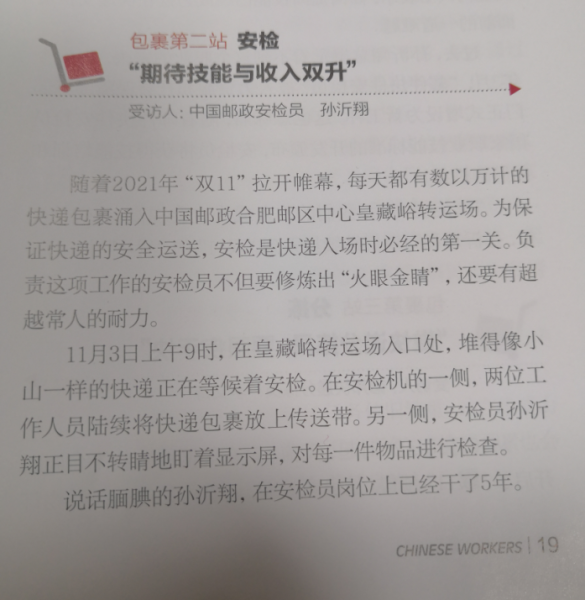中華全國(guó)總工會(huì)主管的《中國(guó)工人》雜志刊發(fā)《一件包裹的“旅程”——購(gòu)物狂歡背后的勞動(dòng)萬(wàn)象》文章,訪談我中心郵件快件安檢工作。文章提到,安檢員一整天都要盯著15寸的屏幕看,分辨幾萬(wàn)件快遞包裹,干這個(gè)活兒需要豐富的經(jīng)驗(yàn),更需要責(zé)任心??爝f安檢員是一個(gè)專業(yè)性非常強(qiáng)的工作。十四大類違禁品和種類繁多的危險(xiǎn)品,都需要安檢員逐一識(shí)別,準(zhǔn)確率的背后需要專業(yè)知識(shí)的積累。