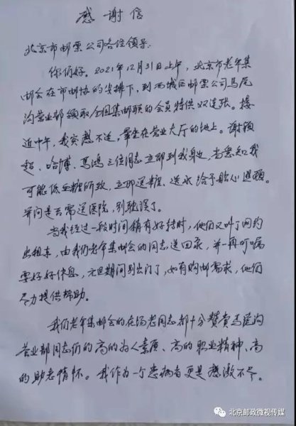 在剛剛過去的元旦假期里,北京市郵政分公司文傳部收到了一位來自北京市老年集郵協會石遐識老先生寫來的感謝信。感謝西城區(qū)馬尾溝郵政支局伸援手搶救暈倒老人,對馬尾溝支局干部員工“高素質、高敬業(yè)精神、高助老情懷”給予高度肯定。