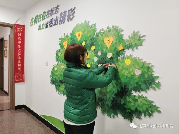 職工小家四周特別設計了員工“心愿樹”、職工文化墻; 豐臺區(qū)方莊郵政支局副局長、部門工會主席王麗萍介紹道:“臨近春節(jié),很多員工都在‘心愿樹’上寫下了新年愿望,你們看現(xiàn)在這棵樹越來越‘枝繁葉茂’了!同時,我們把員工日常開發(fā)的業(yè)務產(chǎn)品、職工藝術作品添加到了職工文化墻上,將大家的智慧成果集中展示在小家這塊新天地里,也是我們這次建家的特別用意?!?/p>