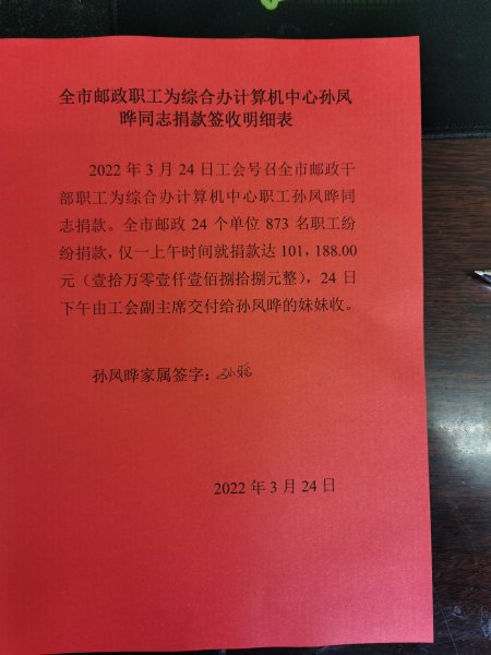 截至3月24日12時,先后有市分公司機關各部門、專業(yè)、區(qū)分公司、縣(市)分公司的24個部門的873名職工通過基層工會捐出愛心款101188元。24日下午14時,孫鳳曄的妹妹孫晗來到市分公司工會,將含有牡丹江郵政職工愛心和濃濃情意的101188愛心款取走,趕赴醫(yī)院為孫鳳曄交住院費,盡快安排孫鳳曄進行手術。