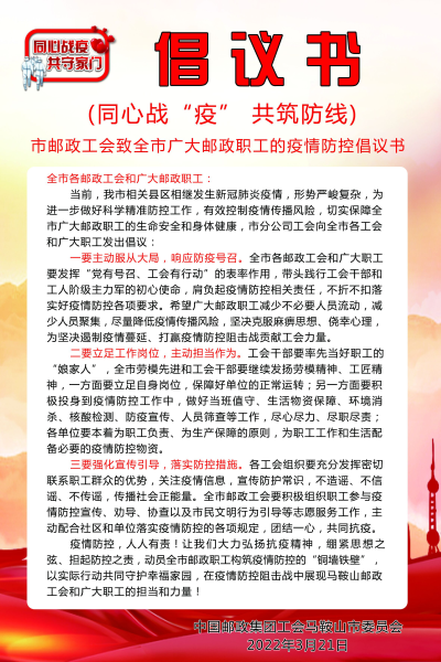 近日,馬鞍山市新冠疫情暴發(fā),給全市郵政生產(chǎn)服務(wù)造成較嚴(yán)重影響,致使投遞等服務(wù)開展艱難,全市約4.6萬件郵件積壓,11個網(wǎng)點(diǎn)停業(yè)。為了抗疫情、保生產(chǎn),馬鞍山市郵政工會第一時間向全市廣大郵政職工發(fā)出《同心戰(zhàn)“疫” 共筑防線》疫情防控倡議書,號召全市干部職工想方設(shè)法克服困難,組織全市人員加班送、駐點(diǎn)送,同時鄉(xiāng)鎮(zhèn)網(wǎng)點(diǎn)20多處職工住在職工小家,堅守崗位,確保郵政服務(wù)不間斷。