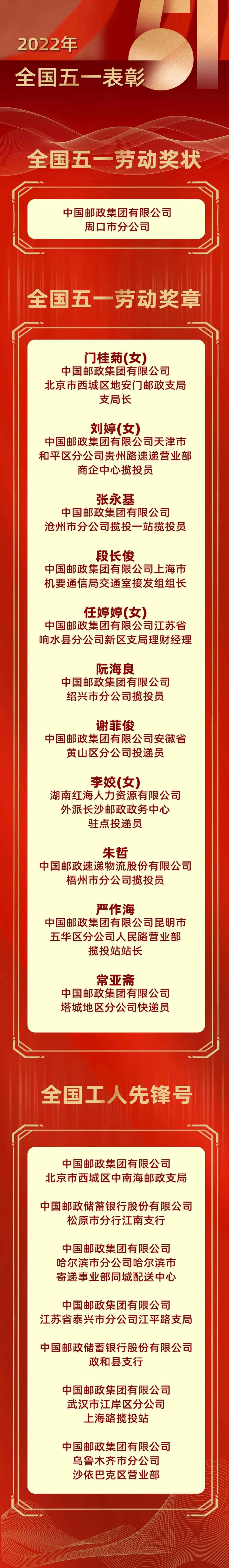 4月28日,中華全國總工會在京召開2022年慶祝“五一”國際勞動節(jié)暨全國五一勞動獎和全國工人先鋒號表彰大會。全國郵政系統(tǒng)有1個集體獲全國五一勞動獎狀,11名個人獲全國五一勞動獎章,7個集體獲全國工人先鋒號。