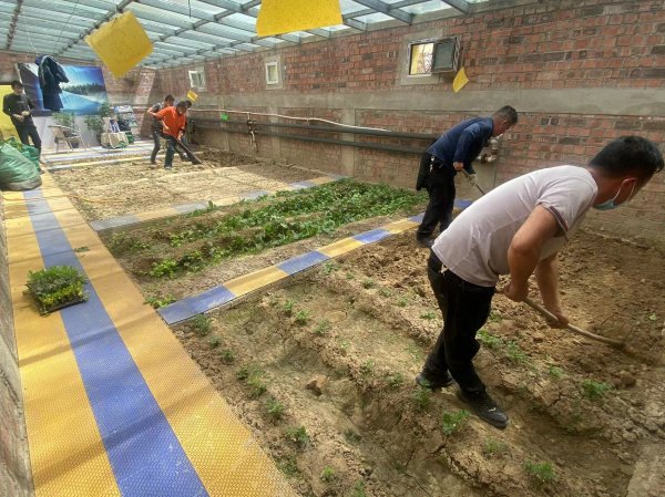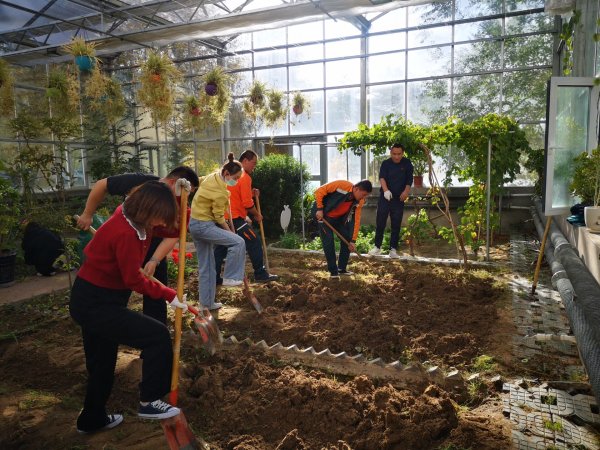 活動中,大家進入溫室大棚積極翻地松土、整理溝槽、合理規(guī)劃、播種澆水、團結(jié)勞作,充分利用手中的鋤頭、鐵鍬、耙子等工具將黃瓜苗、蘿卜、油麥菜、生菜、菜花、芹菜等幾種品種井然有序地栽種到了菜地里,每一道工序,各個環(huán)節(jié)銜接有序,配合默契,呈現(xiàn)出一派熱火朝天的忙碌景象。經(jīng)過大家協(xié)作配合,一排排新栽植的菜苗整齊劃一地出現(xiàn)在面前,溫室大棚內(nèi)頓時變得井然有序,生機勃勃。