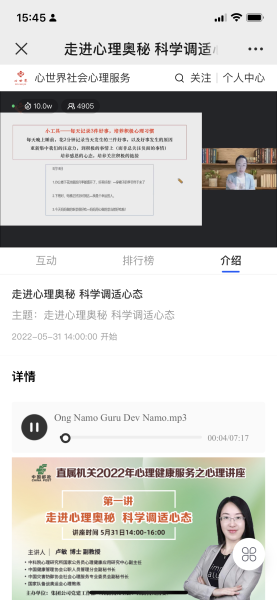今年4月,直屬機關工會組織開展直屬機關員工線上心理測評工作,本次測評主要圍繞5個層面11個指標138題展開。廣大員工積極響應、如實反饋,直屬各單位共有6500名員工參與了心理檢測,專業(yè)機構(gòu)對個人及直屬機關各單位分別出具測評報告。針對測評中顯示的不同群體的各類問題,5月31日,舉辦“走進心理奧秘 科學調(diào)適心態(tài)”專題講座,講座重點結(jié)合心理測評及疫情防控常態(tài)化下員工心理健康情況,通過互動體驗、視頻圖片、案例分析等講解,幫助員工有效應對工作生活中的壓力、問題和挑戰(zhàn),助力員工提高相應認識、掌握相關技巧、提升心理素質(zhì)。直屬機關廣大員工積極參與,5000余人線上收聽收看,500余人次參與互動討論。大家紛紛表示,本次授課理論和實踐相結(jié)合,貼近生活實際,對于解決自身存在的心理困惑起到了有效作用,對自己幫助很大,今后能夠更加坦然、理智地看待心理問題,更好克服負面情緒,調(diào)整好心態(tài),以更加積極向上的精神狀態(tài)投入到工作和生活中。