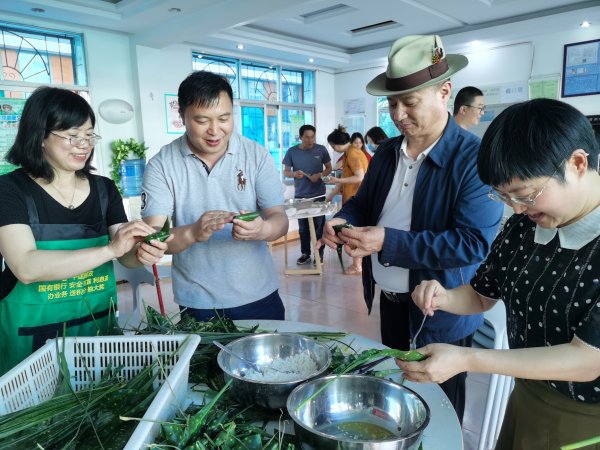 師傅現(xiàn)場帶徒弟,有手藝的教“新學(xué)生”,“新學(xué)生”聚精會神認真學(xué)習,一個個立體的三角粽在心靈手巧的職工手中卷、裝、包、捆中立馬成型,包餃子小組各司其責各式各樣的餃子也一一呈現(xiàn)出來。包粽子、餃子的手工活可不僅限于女職工,臥虎藏龍的男職工也大顯身手,大家沉浸在濃厚歡快的節(jié)慶氛圍中。