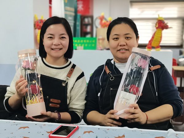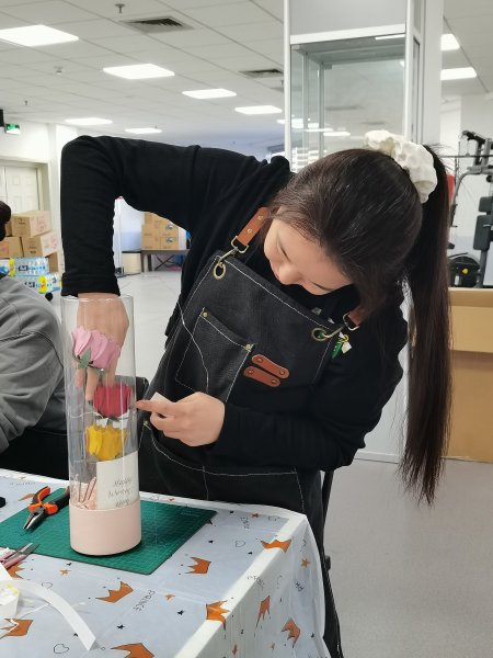 老師首先講述了皮革的基本知識,隨后為大家講解皮革玫瑰花的制作流程,跟隨老師的講解,大家各自挑選了自己喜歡的皮革顏色,迫不及待地開始動手體驗。一朵朵花瓣在大家的巧手中變得生動美麗,經(jīng)過一番精心制作,一朵朵嬌艷欲滴的漂亮玫瑰花便制作完成。大家將親手制作的玫瑰花插入透明花桶,用燈帶點綴?;顒蝇F(xiàn)場還為大家準(zhǔn)備了“女神節(jié)快樂”的手寫卡片,將卡片放入花桶,打開燈的瞬間幸福感、氛圍感拉得滿滿的。