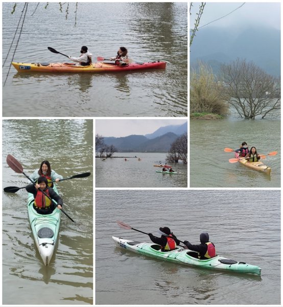 抵達(dá)桐洲島后,首先進(jìn)行的是刺激的皮劃艇體驗(yàn)項(xiàng)目。大家先在專業(yè)教練的指導(dǎo)下,學(xué)習(xí)了皮劃艇的基本技巧和安全知識(shí);隨后便兩兩組隊(duì),分批登上皮劃艇,泛舟于富春江上,欣賞春日的美景。從初登艇時(shí)的手忙腳亂、進(jìn)退左右不分,到與搭檔磨合熟練后的進(jìn)退自如、快慢由心,大家在歡聲笑語中悄然增進(jìn)了彼此的配合與默契。